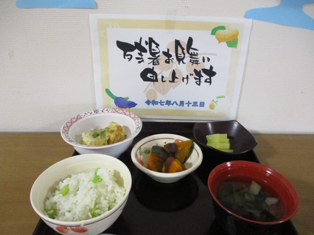 枝豆ご飯と揚げ出し豆腐、かぼちゃのいとこ煮、すまし汁、果物の献立でした。