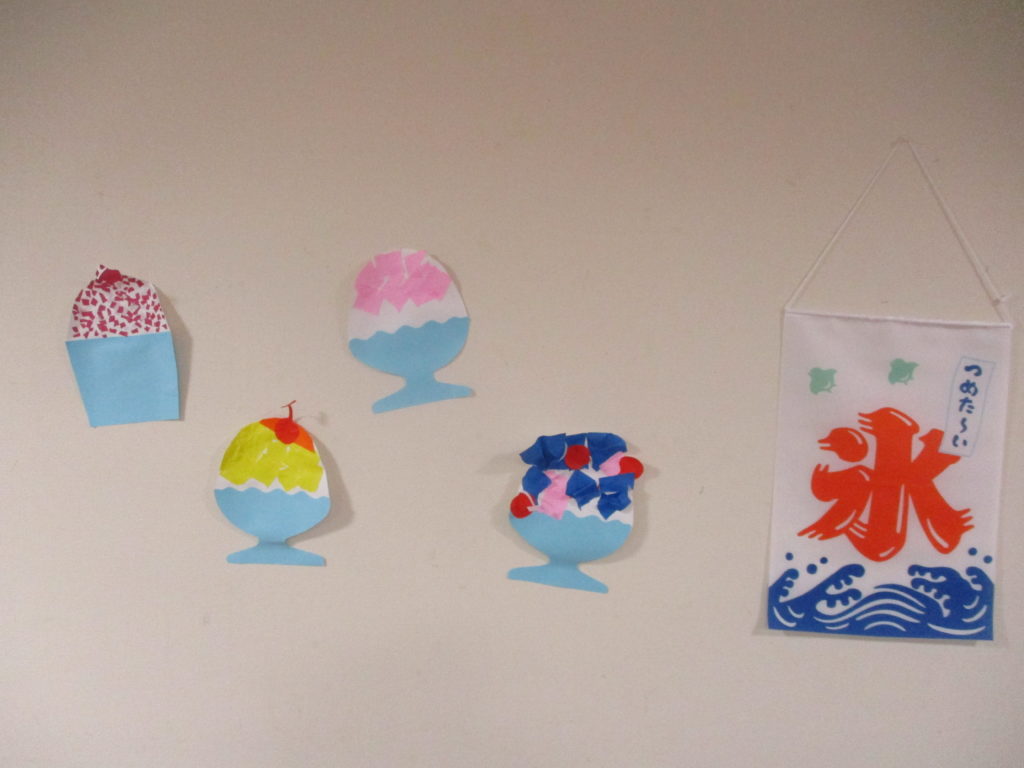 8月は、暑い日々に少しでも涼を感じて頂けたらと、折り紙でかき氷の壁飾りを制作しました。